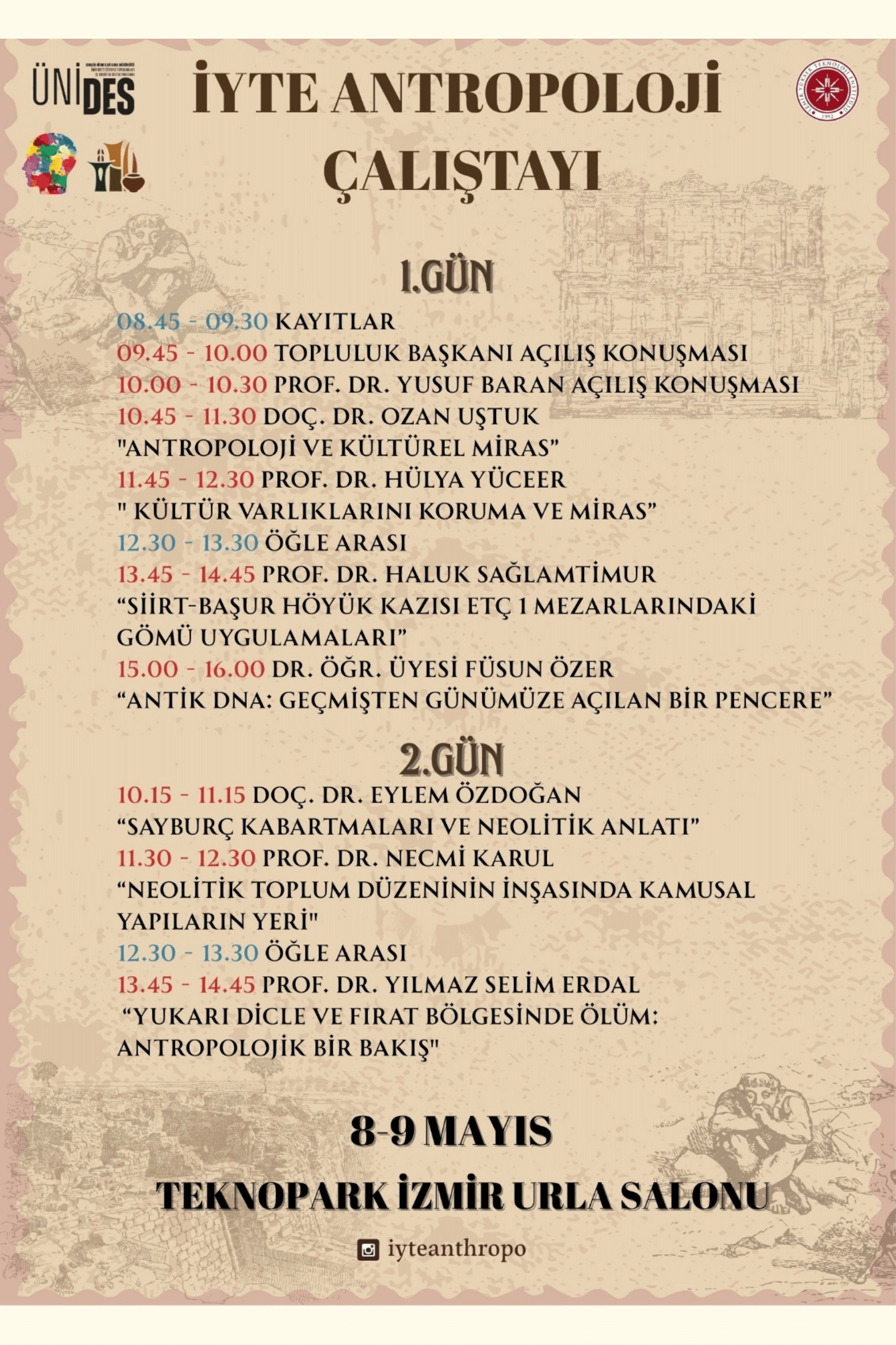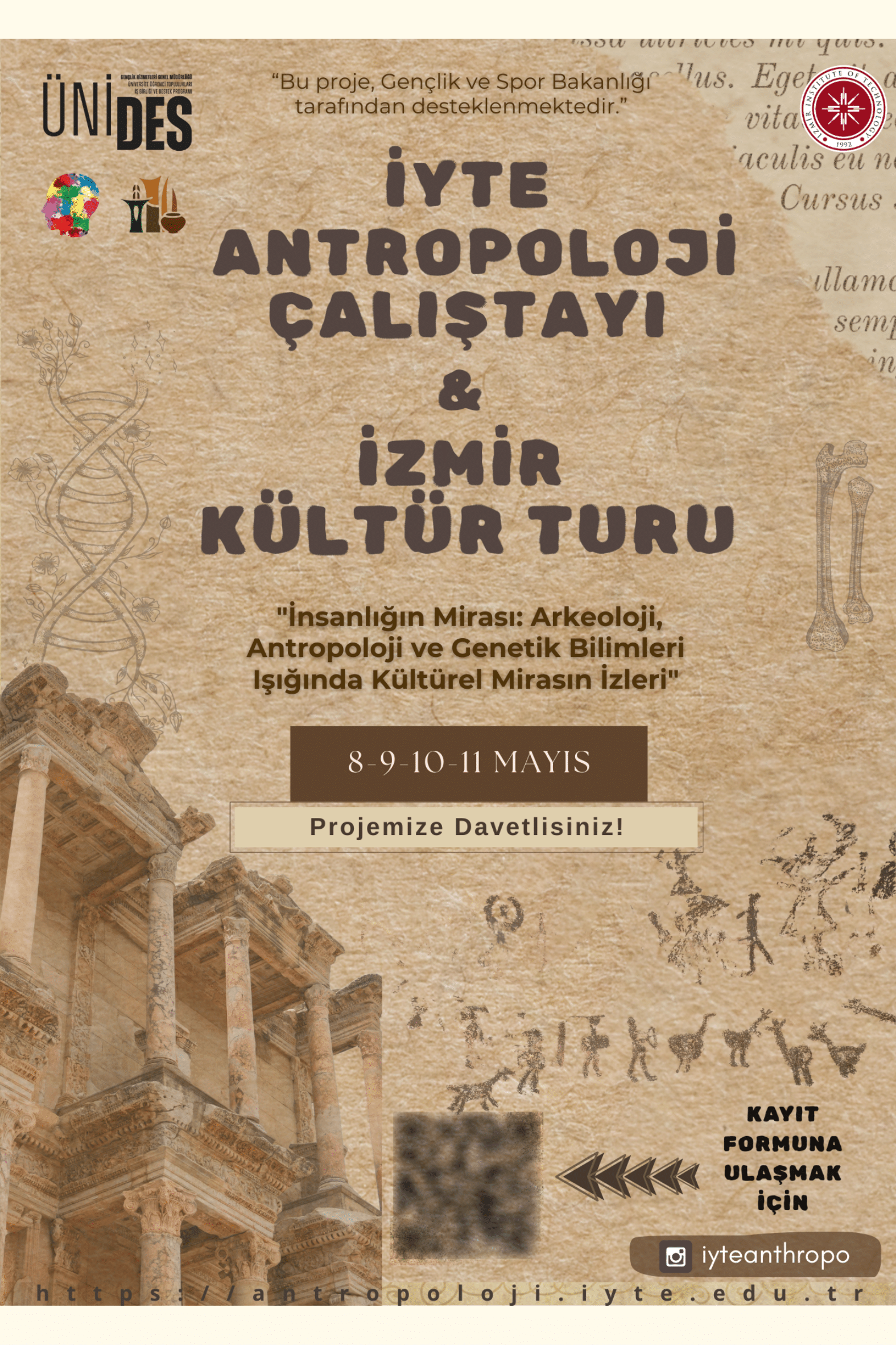 Gençlik ve Spor Bakanlığı tarafından yürütülen Üniversite Öğrenci Toplulukları İş Birliği ve Destek Programı (ÜNİDES) kapsamında, “İYTE Antropoloji Çalıştayı ve İzmir Kültür Turu” adlı projemizle ulusal düzeyde destek almaya hak kazandık. Bu kapsamda iki gün süren İYTE Antropoloji Çalıştayı’nı gerçekleştirerek İzmir, Ankara ve İstanbul’dan gelen akademisyenlerin sunumlarını dinledik. Çalıştayın ardından düzenlenen iki günlük İzmir kültür turunda ise kentteki kültür varlıklarını ve arkeolojik kazı alanlarını, profesyonel rehberler ve kazı başkanları eşliğinde ziyaret ettik.