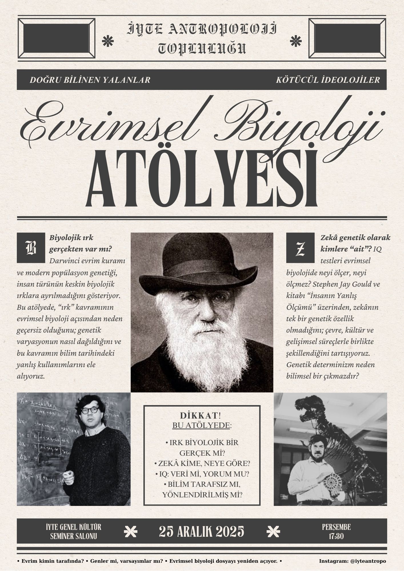 2023-2024 döneminde ilkini gerçekleştirdiğimiz Evrimsel Biyoloji atölyesinde bu dönem yine evrimsel biyolojinin tarihsel gelişimini ve temel kavramlarını inceledikten sonra ‘doğru bilinen yanlışlar’ başlığı altında “zeka ve IQ” ve “biyolojik ırk” kavramlarını değerli akademisyenlerimiz eşliğinde tartıştık.